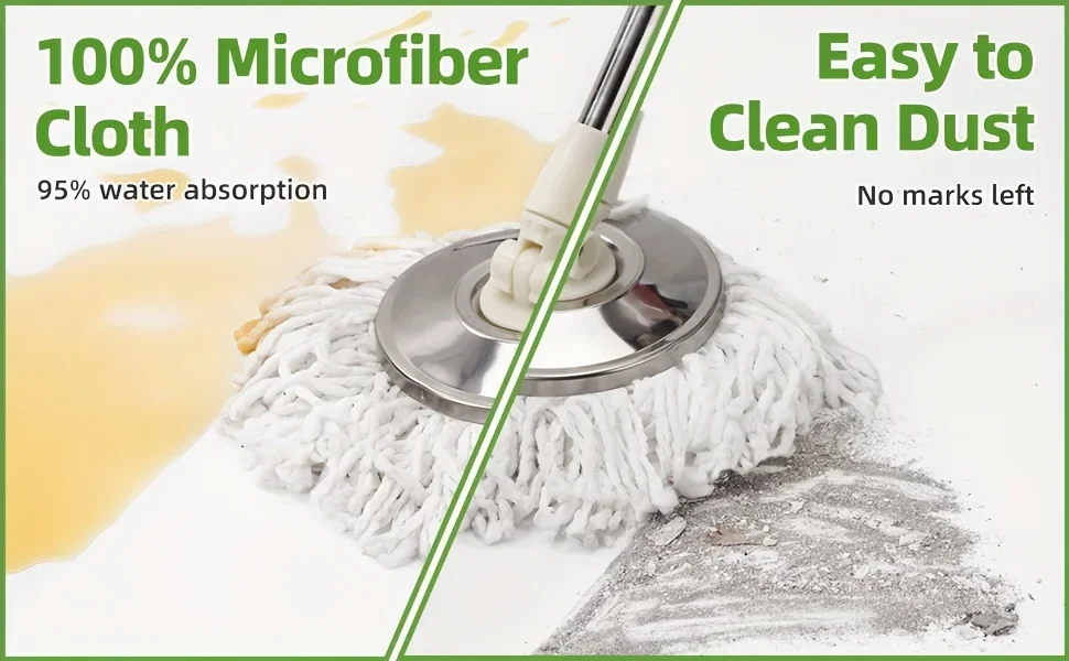 We include 3 high-quality, machine-washable microfiber mop heads. They are highly absorbent, trapping dust and liquid efficiently, and can be reused after washing, making them an economical and eco-friendly choice.