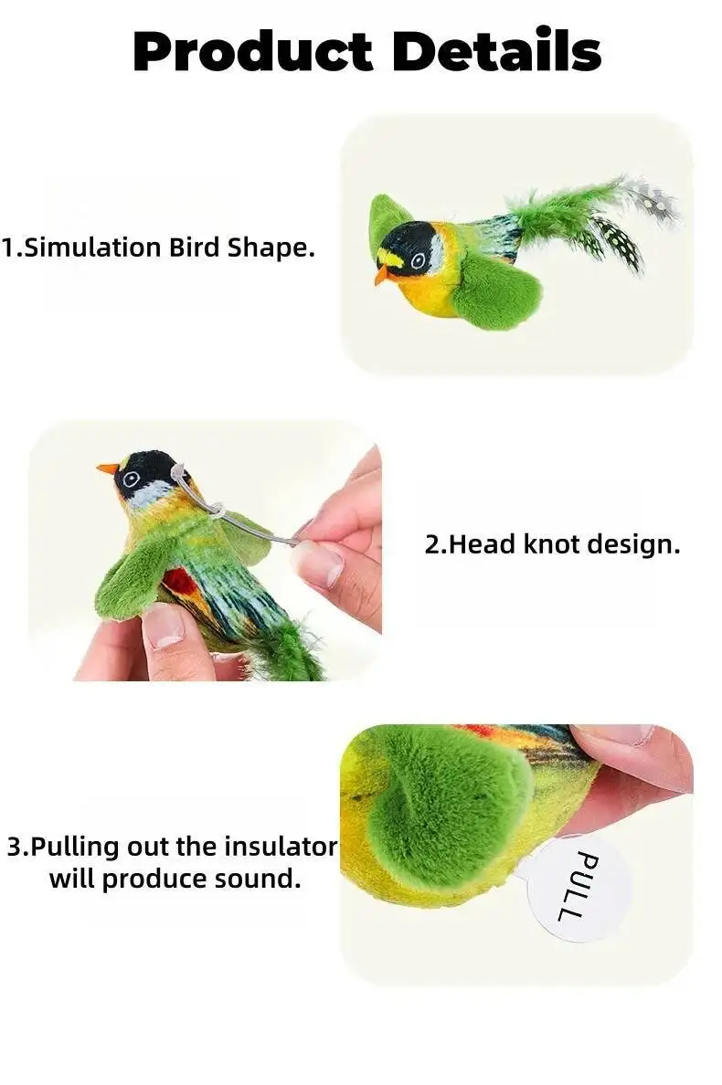 Introducing the chirping bird toy, a must-have for your feline friend! Crafted from high-quality, non-toxic plush material, this toy ensures safety and durability. Easy to clean, it guarantees a long-lasting and healthy playtime experience.