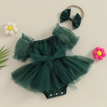 Baby Girls Summer Casual Romper Dress Short Sleeve Bow Tulle Romper with Headband