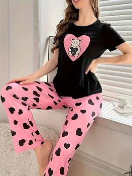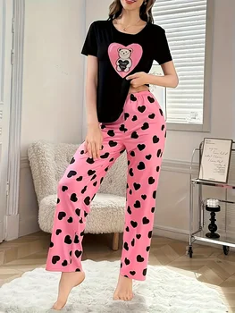 β Age-defying design: round neck short-sleeve top paired with all-over heart print pants, featuring adorable bear and heart prints for a sweet and girly vibe.