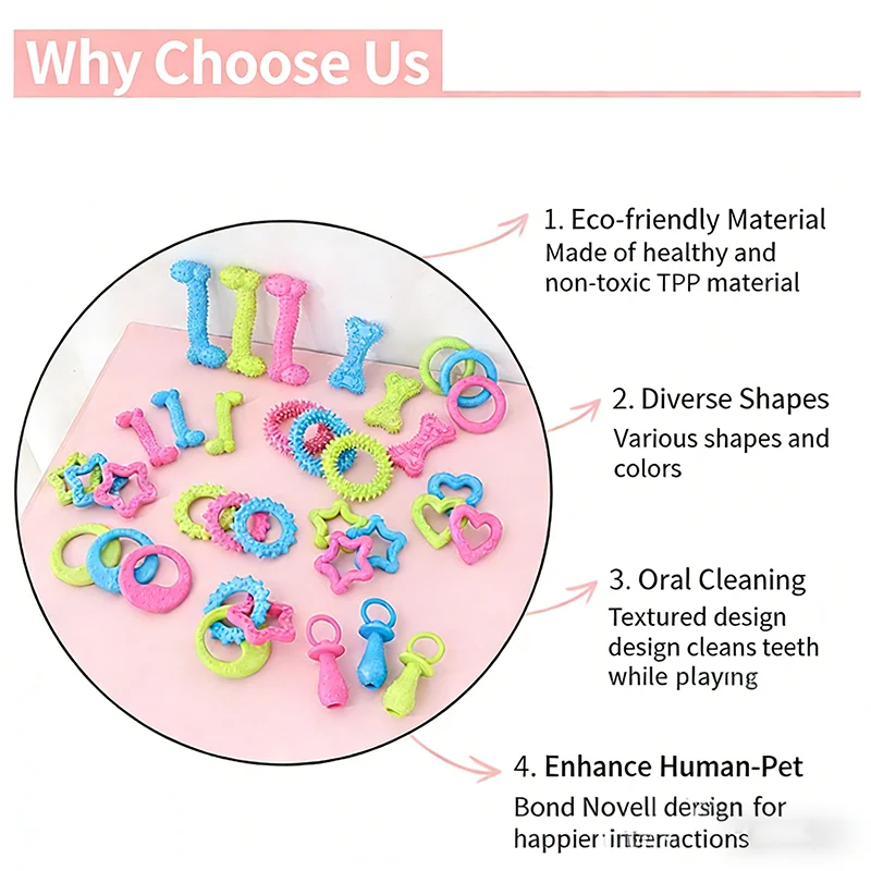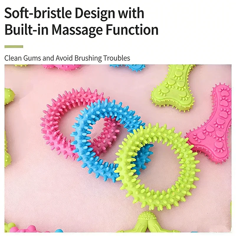 Made from food-grade, non-toxic TPR material, it features a variety of shapes—including textured bones, playful pacifiers, and spiky rings—that provide 360° teeth cleaning and gum massage.
