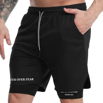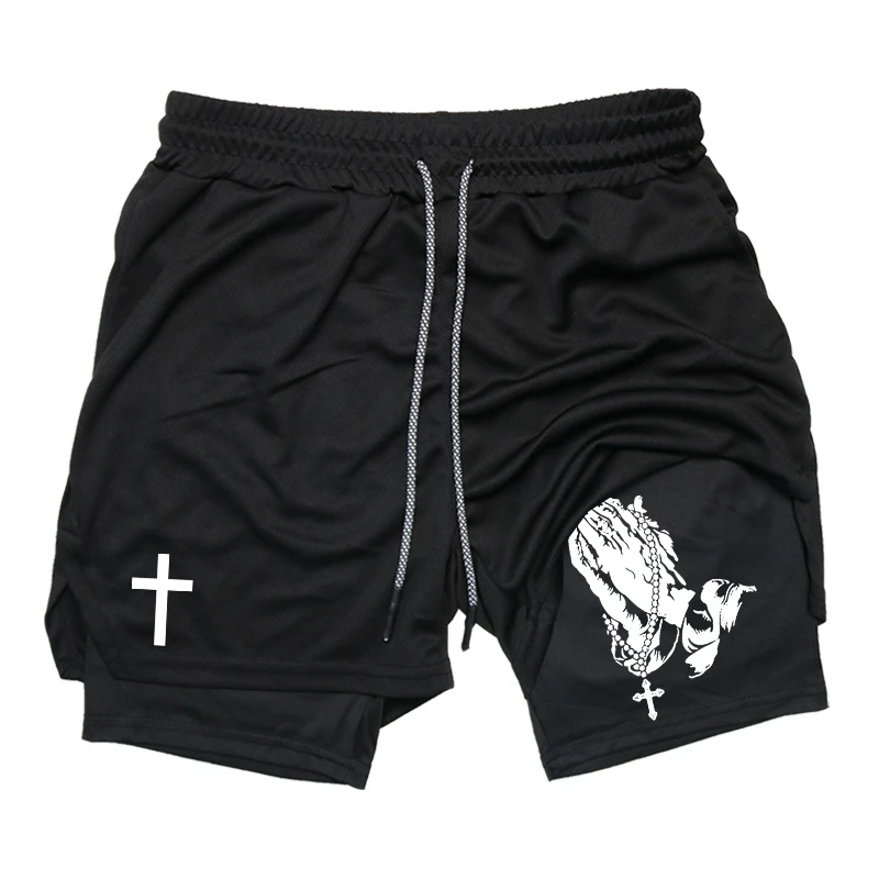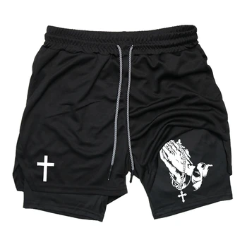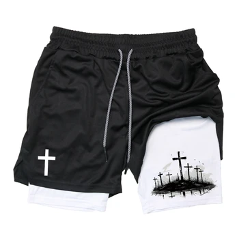 Print 2 in 1 Running Workout Shorts for Men Christian Gym Athletic Performance Shorts with Phone Pocket Towel Loop Activewear
