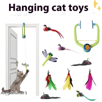 【E】Interactive Hanging Cat Toy for Door, Self-Play Teaser with Swinging Feathers & Replaceable Prey Attachments