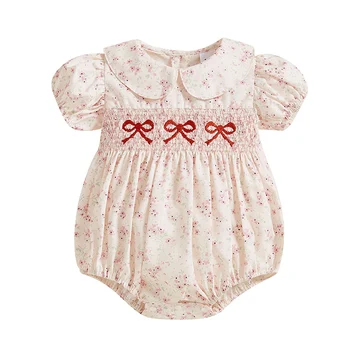 0-18M Infant Baby Girls Bowknot Embroidered Rompers Lovely Floral Print Doll Collar Short Sleeve Bubble Jumpsuits for Newborn